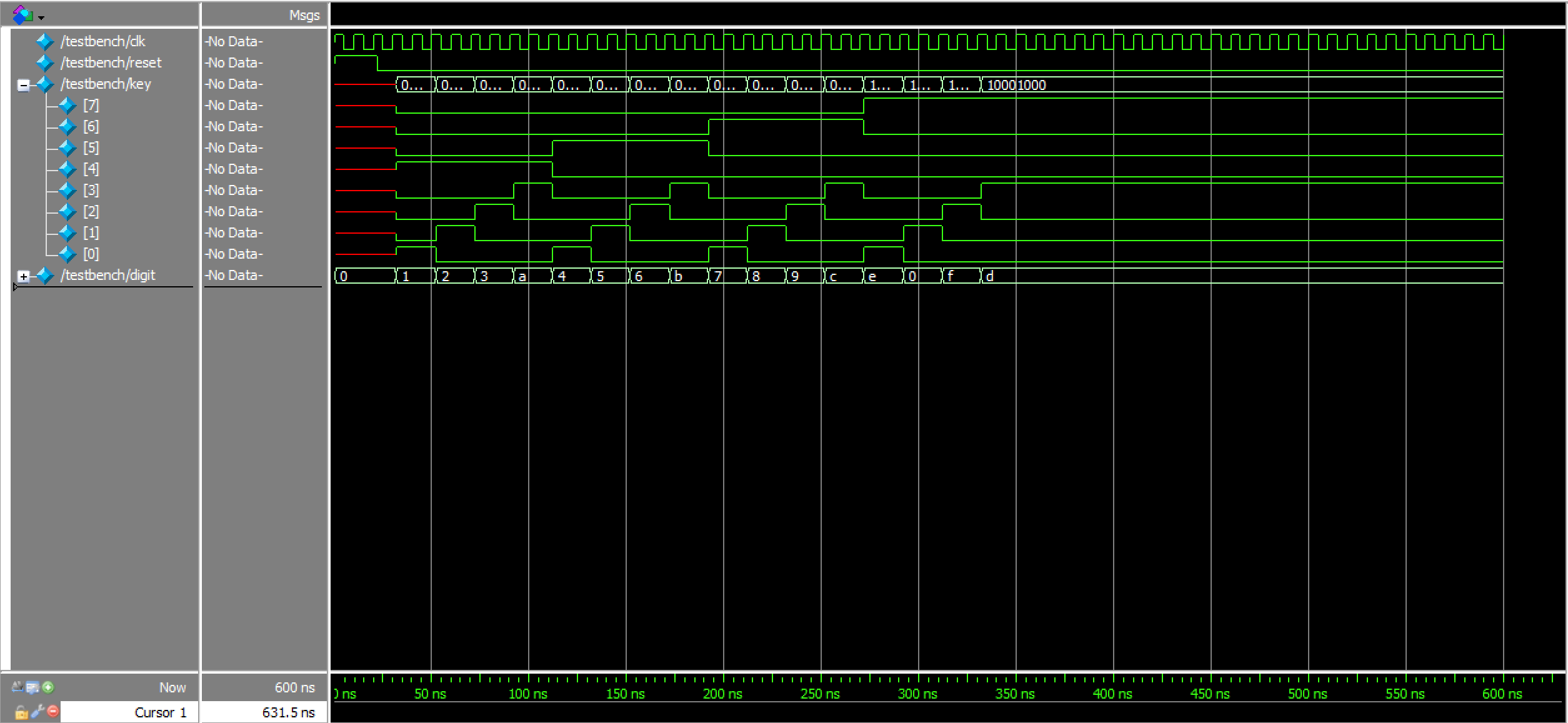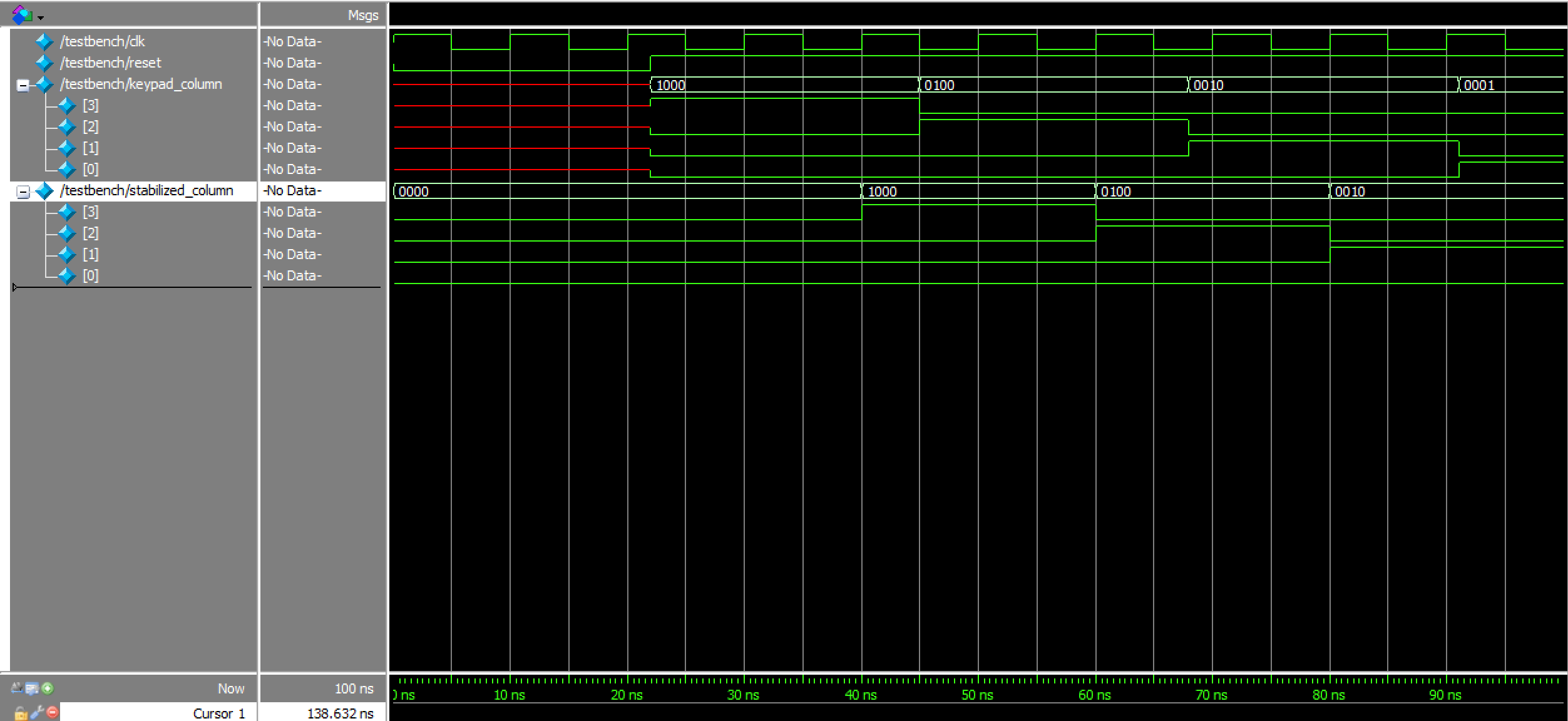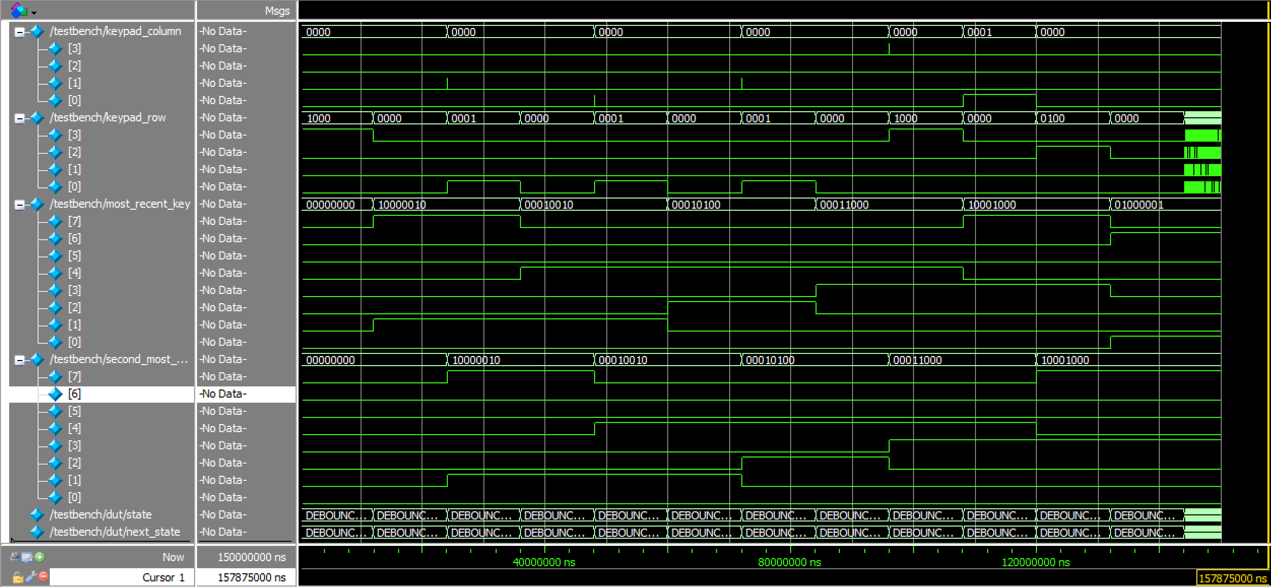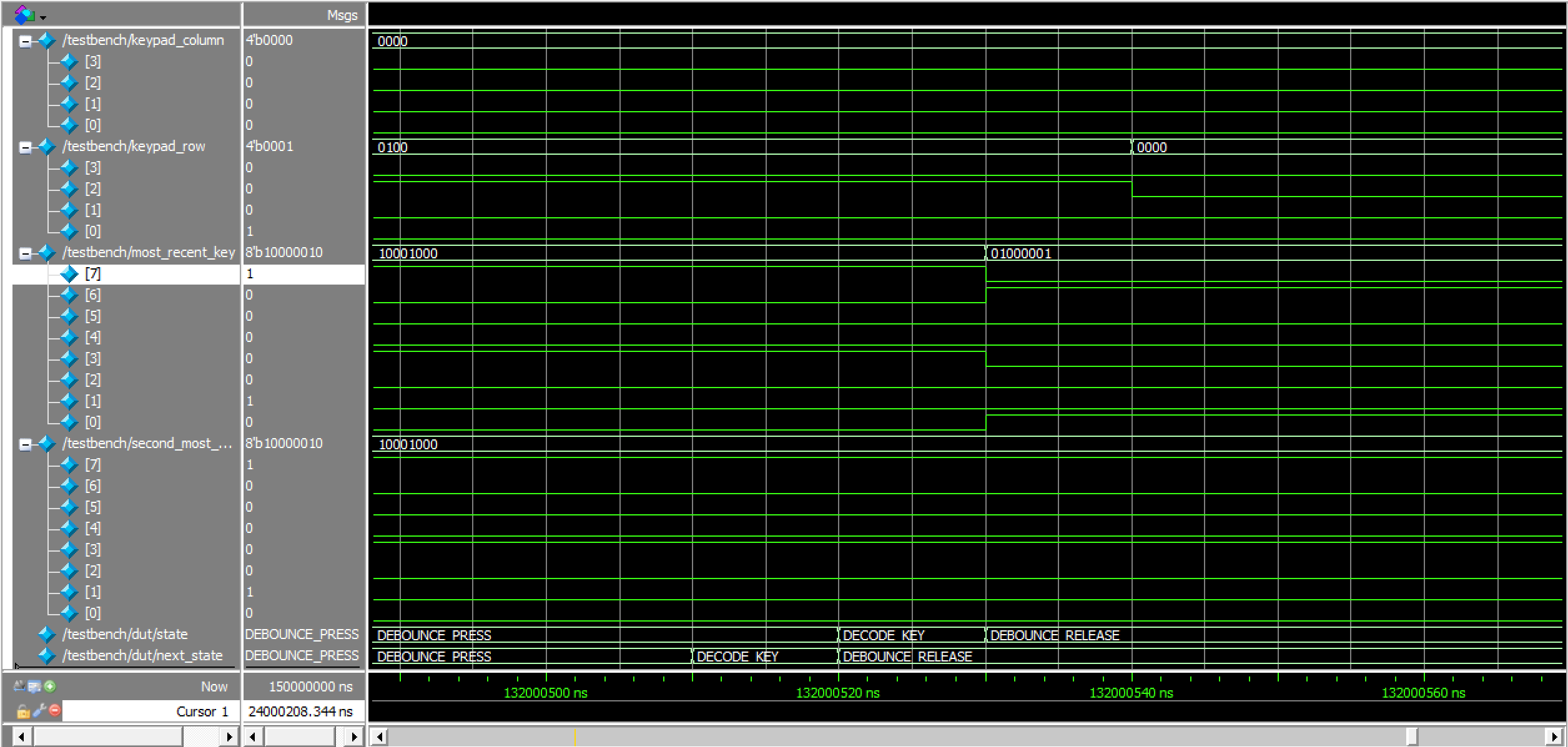 The keypad scanning and debouncing FSM waveforms can be viewed in Figures 8a, 8b, and 8c below. As expected, the FSM was in the correct state at any given point in time, and cycled through them appropriately in response to a variety of inputs, including a short, single key press, a prolonged key press, and key presses that occurred after an initial button was already pushed.