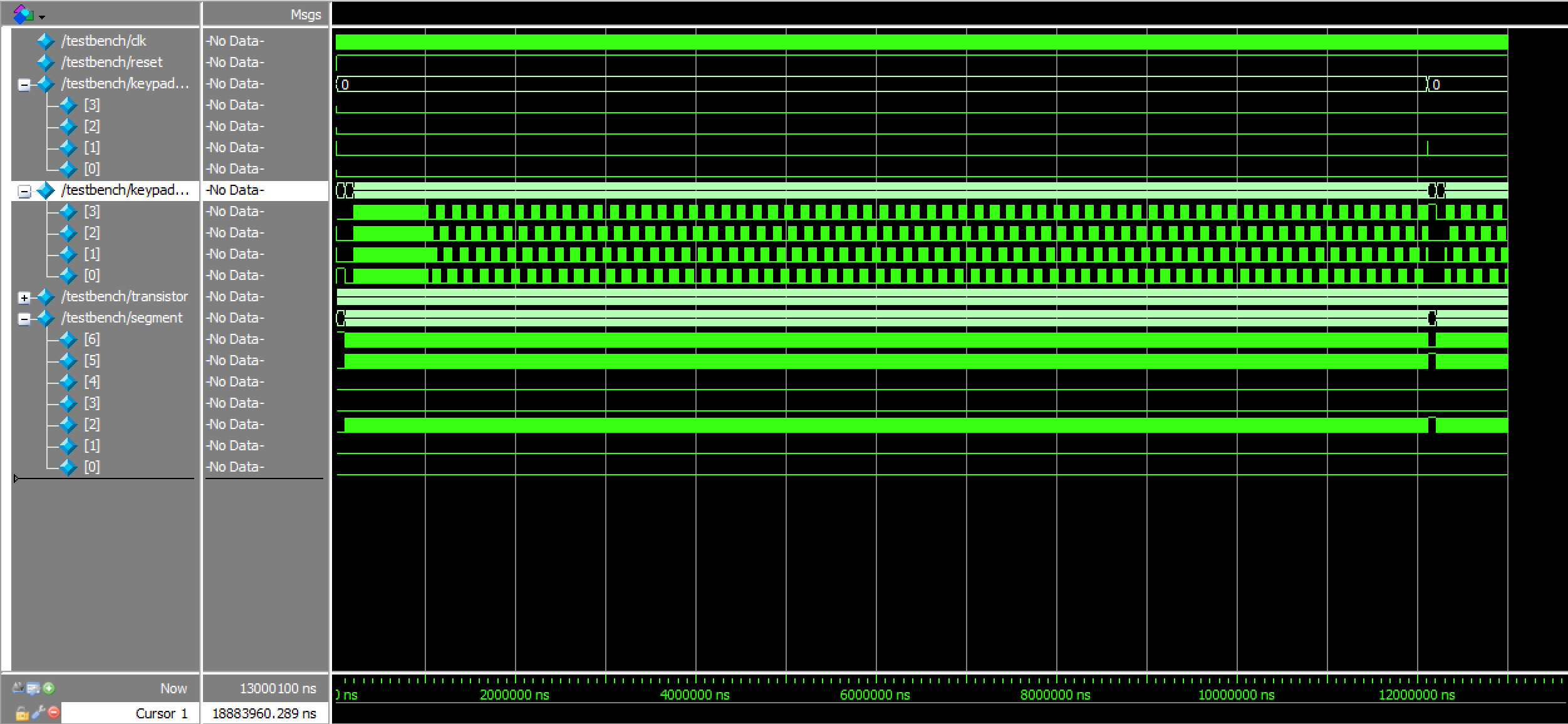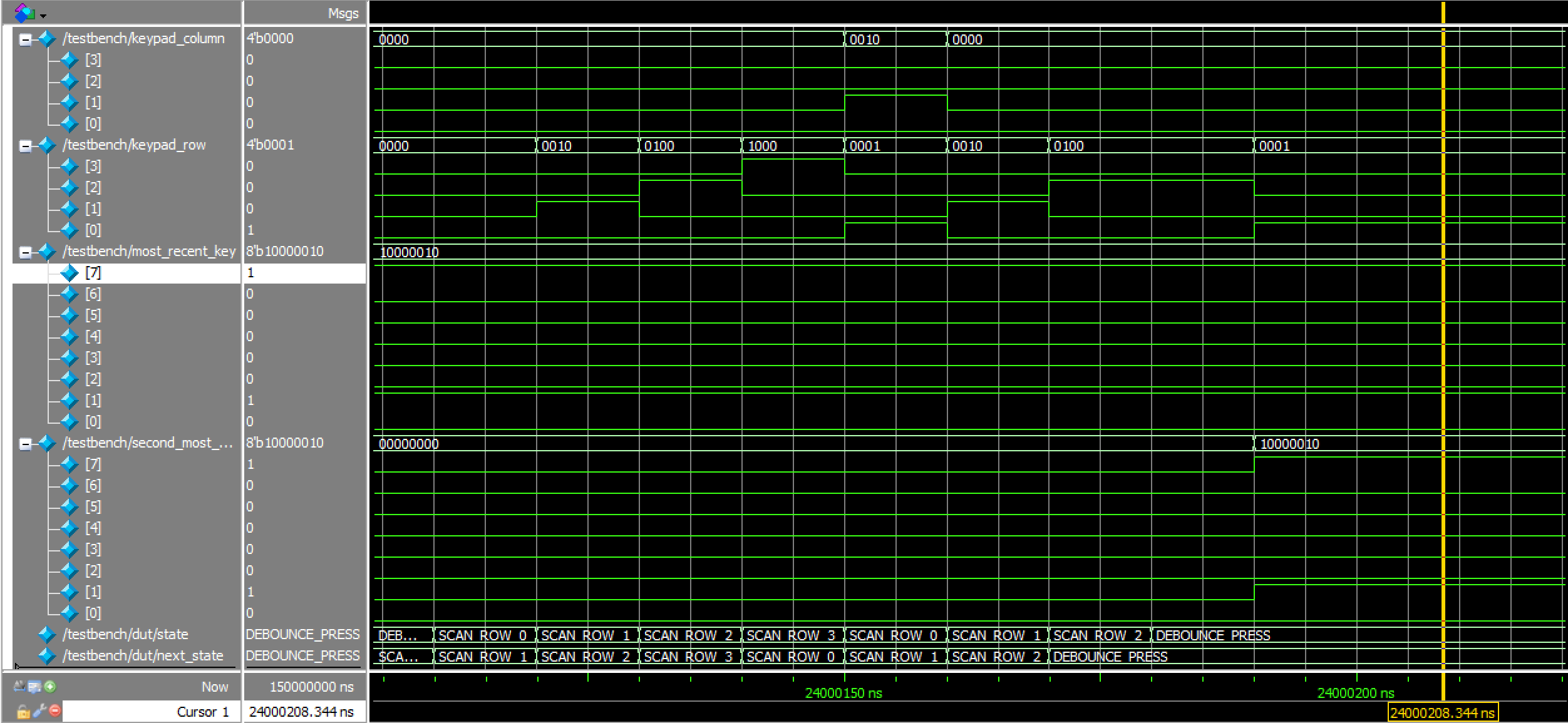 Because the top module took such an excessively long period of time to run — which was as intended with the integration of two 0.1 s (i.e. 10 Hz) long debouncing states, just unfortunate — only two key presses were actually simulated with it. However, due to the rigorous verification of all the submodules comprising it, this was deemed acceptable, as it still showed that everything was properly interfaced. Evidently, the cycling of which row is powered is shown, as well as the responses to such; when a column going high is detected, the waveforms also demonstrate that the correct toggling of the 7-segment display segments shortly follows (based on the value of output transistor).