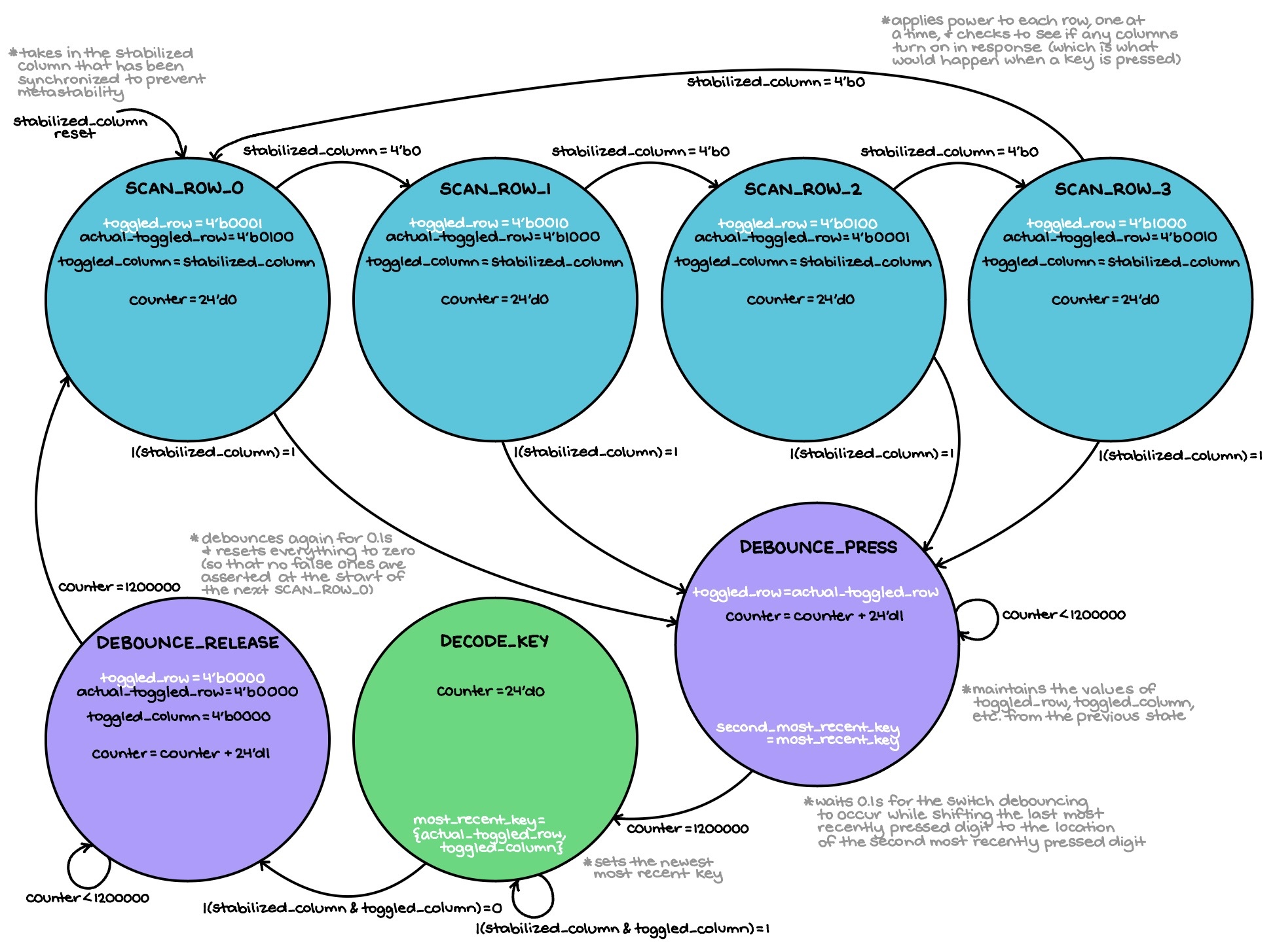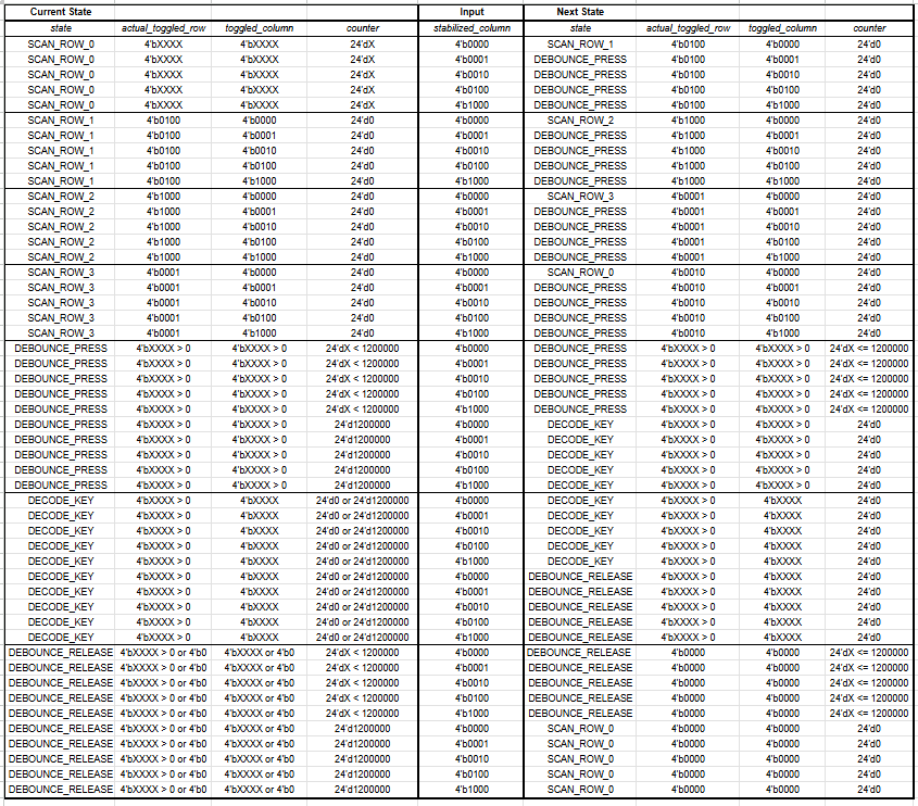 Lastly, the FSM performs a second round of 0.1 s debouncing while resetting both the stored/asserted row and column values to zero, so as not to trigger any false button presses with residual high values when moving back to that very first scanning state.