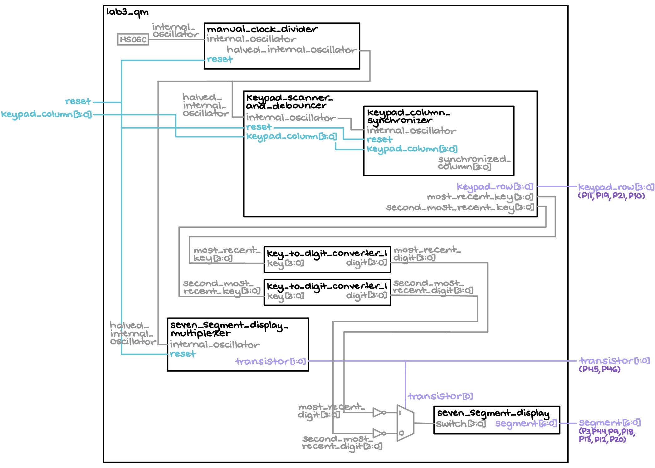 The block diagram in Figure 1 depicts the general architecture implied by the SystemVerilog code. The top-level module, titled “lab3_qm,” comprises a high-speed oscillator module that generates a 48 MHz signal, which is immediately halved in the ensuing “manual_clock_divider” block; this ultimately results in a 24 MHz halved_internal_oscillator clock that is fed to the rest of the time-dependent components. One such component is the “keypad_scanner_and_debouncer” module, which contains an FSM that first stabilizes the column inputs with a “keypad_column_synchronizer,” before determining and subsequently storing the locations of the two most recently pressed keys — all the while simultaneously accounting for debouncing (see below for more details). This then allows “key_to_digit_converter_1” to turn these saved locations into their corresponding hexadecimal values so that they may be interpreted by the “seven_segment_display” and turned into actual, illuminated outputs. Finally, the “seven_segment_display_multiplexer” module alternates the activation status of the two transistors that actually drive the 7-segment displays, and is immediately followed by a mux that decides which digit is showing at any given point in time.