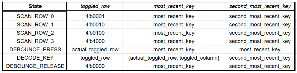 The Figure 2 FSM illustrates the seven main stages of key detection, switch debouncing, and digit shifting based on recency. Note that the actual Verilog implementation of this FSM is not quite standard, but effective in reaching the end goal nonetheless. After parsing both the code and diagram for the specific signals being toggled, the following Figures 3a and 3b were created for ease of understanding and general transition-tracking.