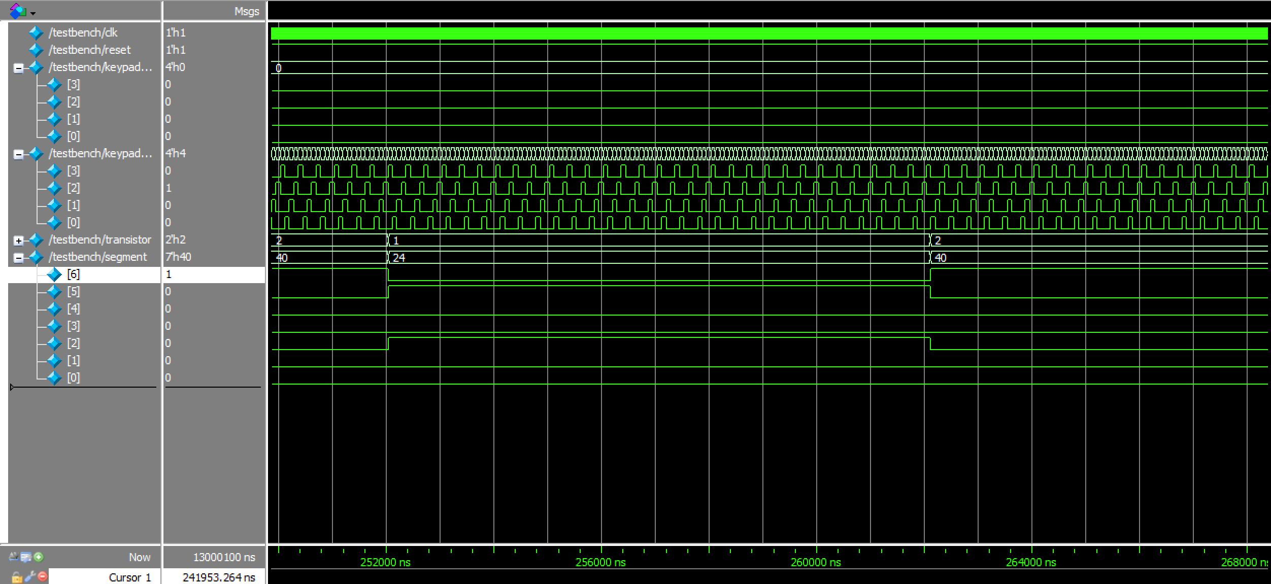 Overall, there were two inputs — including a reset (reset) and four keypad columns (keypad_column[3:0]) — and three outputs — a row activator (keypad_row[3:0]), transistor toggler (transistor[1:0]), and 7-segment display setter (segment[6:0]) — to the design.