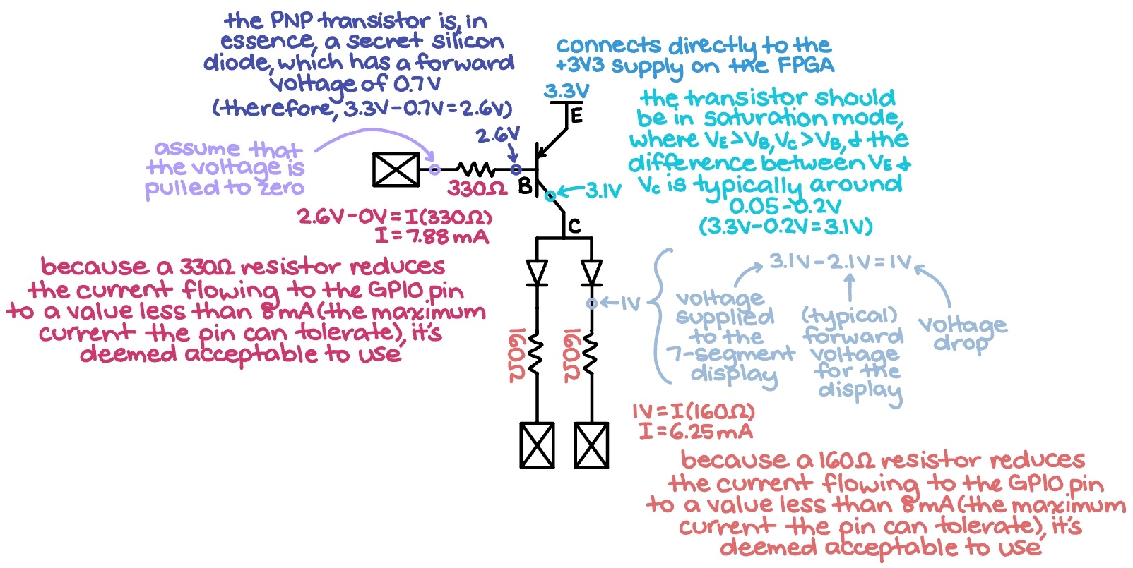 As specified in section 4.17 of the ice40 datasheet for the FPGA (and previously mentioned in the Lab 2 documentation), the current flowing into each GPIO pin should ideally be 8 mA at most. Thus, to justify the the particular resistors chosen, Ohm’s Law was applied to each part of the zoomed-in segment of the main circuit, clearly demonstrating that all current draw fell within recommended operating conditions. Ultimately, for the sake of equal brightness across all segments, seven 160 Ω-resistors were integrated into the 7-segment display circuit, while both transistor bases received current-limiting resistors of 330 Ω. (Sources for the cited transistor information above comprise SparkFun Electronics and Glenn Lockwood. Additionally, the 7-segment display datasheet was used to find the forward voltage necessary to complete the correct calculations.)