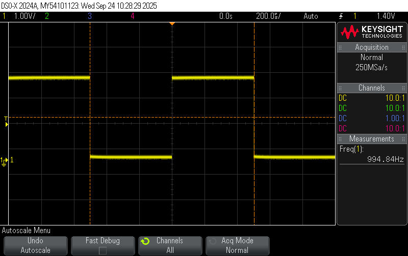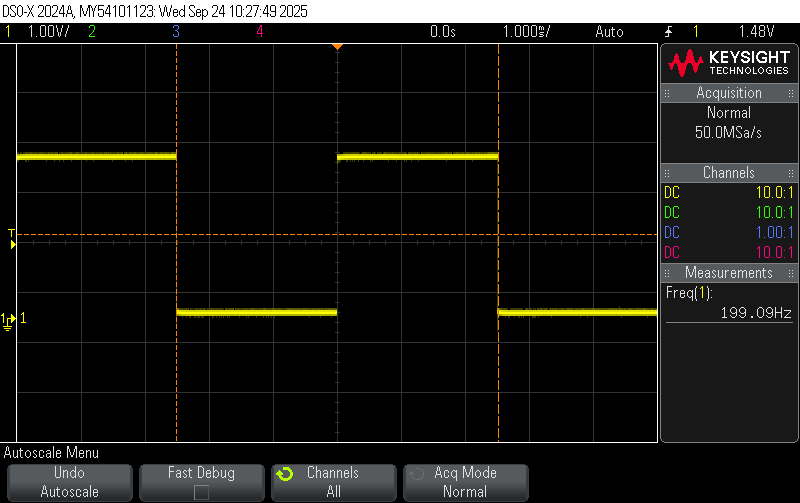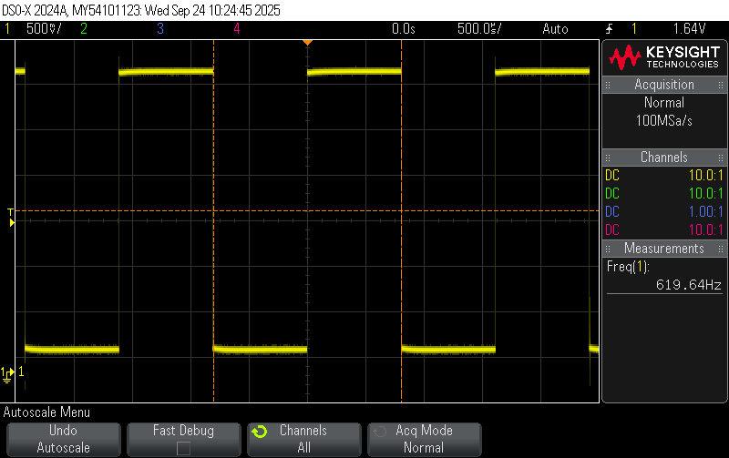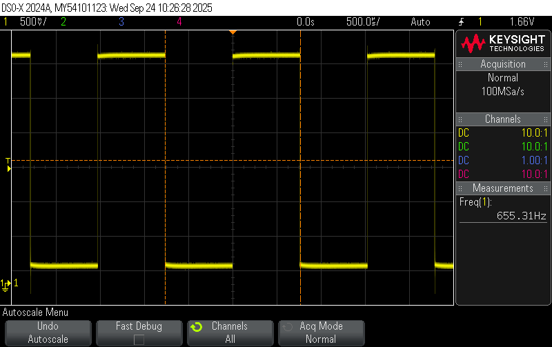 In order to verify that the speaker was outputting the correct pitches as intended, an oscilloscope was used to determine the actual frequencies being played for the first two notes of Für Elise. When compared to the expected values of 659 and 623 Hz, respectively, it was suffice to say that the design did, in fact, perform rather accurately.