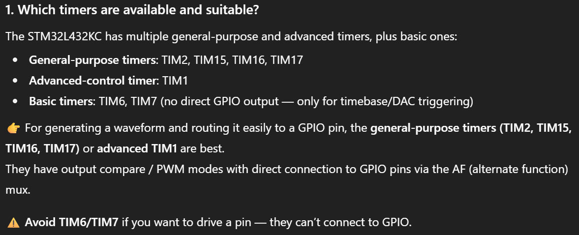 Most notably, the AI was correct in its timer overview (as depicted in Figure 7), with the recommended general purpose timers TIM15 and TIM16 being exactly what was used in the actual lab above.