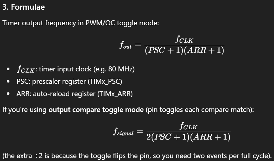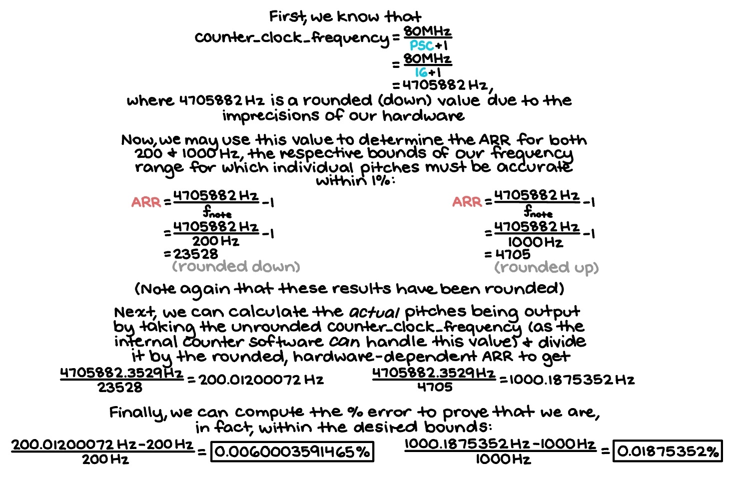 Furthermore, the provided formulae for both the note frequency and the duty cycle calculations were surprisingly correct. These are shown in Figure 8 below. The only things that were missing were the equations for ARR when trying to prolong the duration of a note.