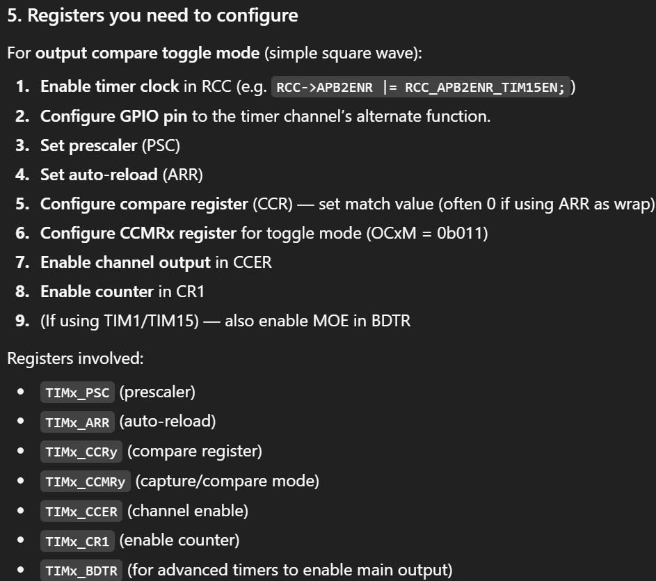 The LLM was also pretty accurate when it came to listing registers that needed to be configured, as seen in Figure 9. All of the registers it suggested were, in fact, necessary to consider; however, it did omit a few crucial ones. For instance, the Update Generation bit in the Event Generation Register was also rather important to set, as well as the SMS bits in the SMCR.