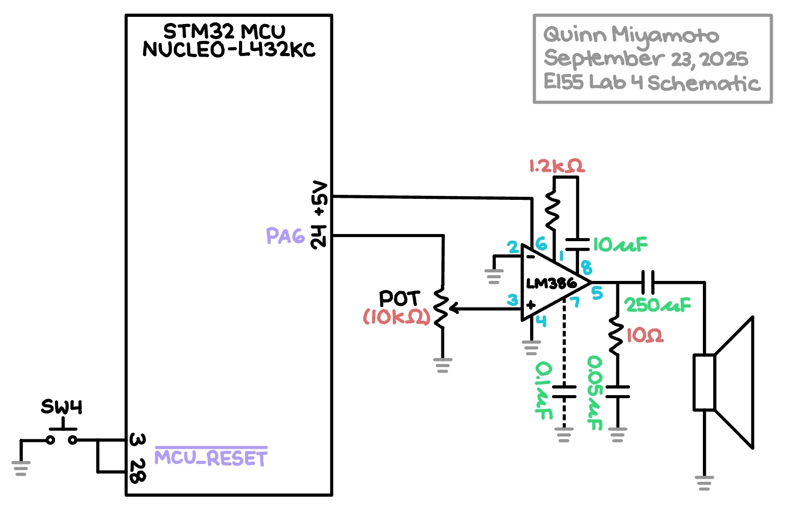 Evidently, all of the Lab 4 specs were met; all of the notes were the correct pitches and lasted for the appropriate durations. Although the specific potentiometer used didn’t allow for the finest volume control possible, it still worked well enough that it was deemed acceptable to keep.