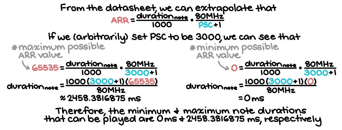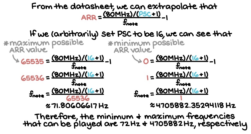 Additionally, the minimum and maximum possible frequencies and durations supported with the current prescaler values — what the internal system clock is ultimately divided by for the timer’s convenience — used in the code can be viewed in the following Figures 2a and 2b.
